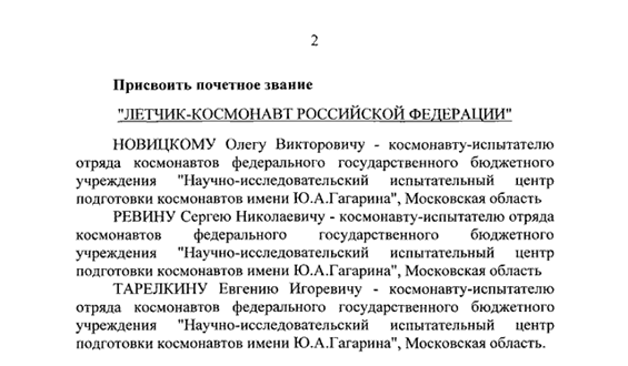 Род занятий в настоящее время: 9 июня на заседании Межведомственной квалификационной комиссии присвоена квалификация «космонавт-испытатель» и вручено удостоверения космонавта № 201