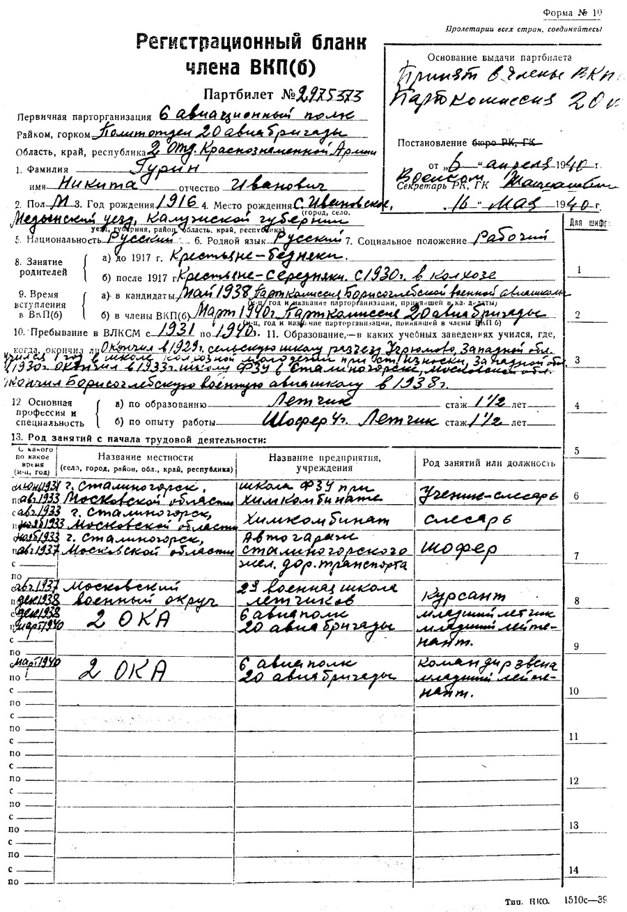 16 мая 1940 года (постановление от 6 апреля 1940 г.) парткомиссией 20 авиабригады принят в члены ВКП(б);