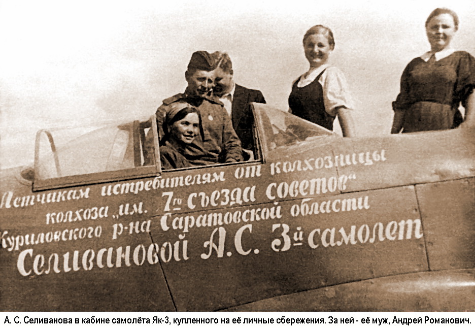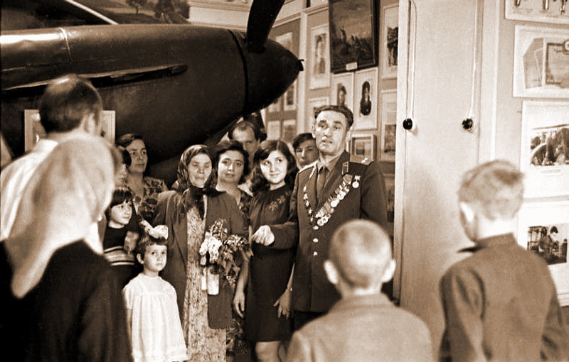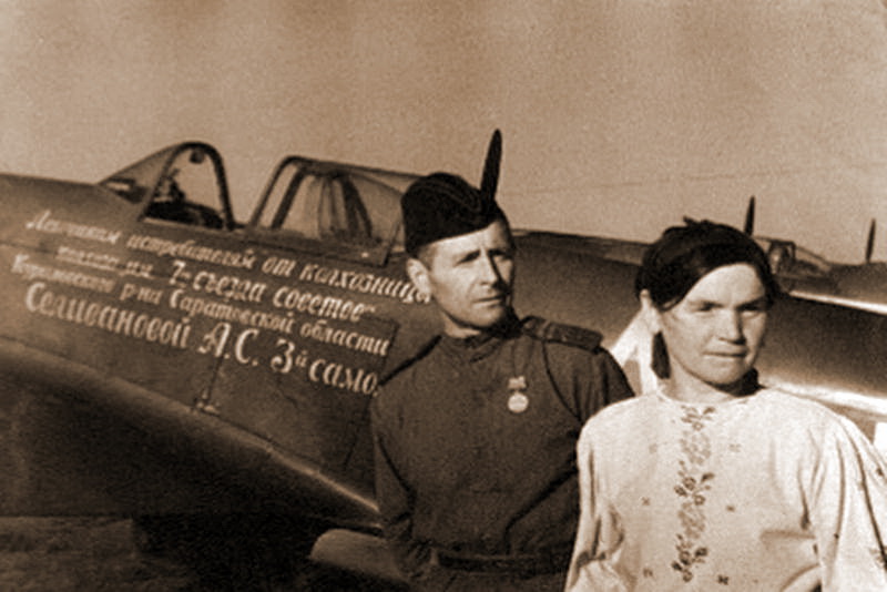 А.С. Селиванова (в центре), в войну купившая 3 самолёта для фронта, и А.С. Суравешкин, летавший на одном из этих самолётов, в музее города Саратова у самолёта Як-1. 9 Мая 1970 года.