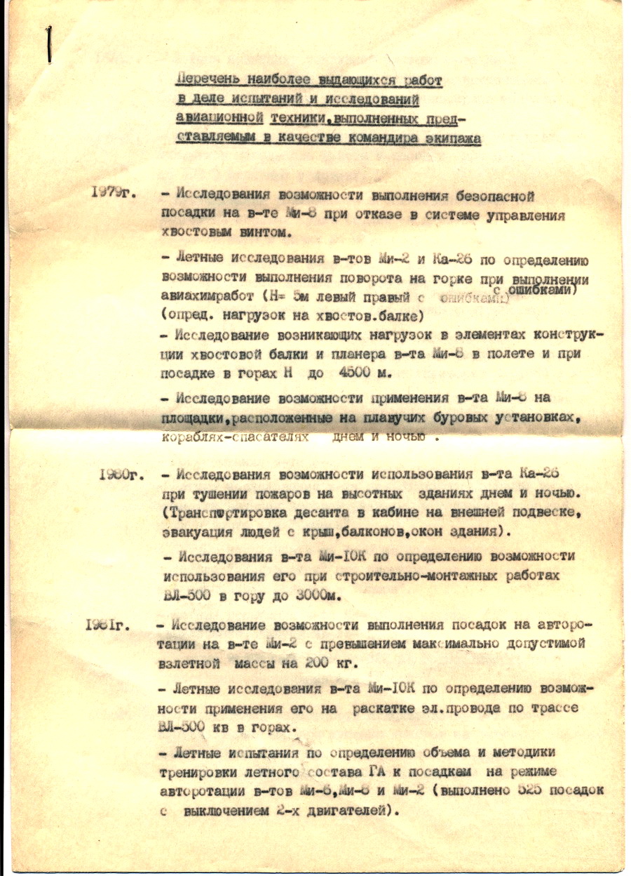 Перечень наиболее выдающихся работ в деле испытаний и исследований авиационной техники:
