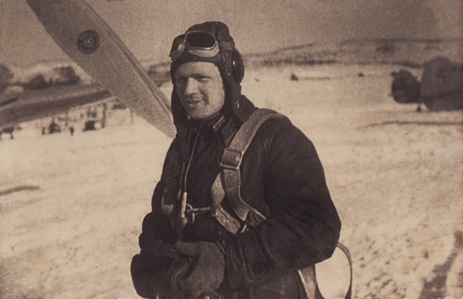 Анатолий Елисеев после боевого вылета. Кадр из «Союзкиножурнала» № 38. 1942 год