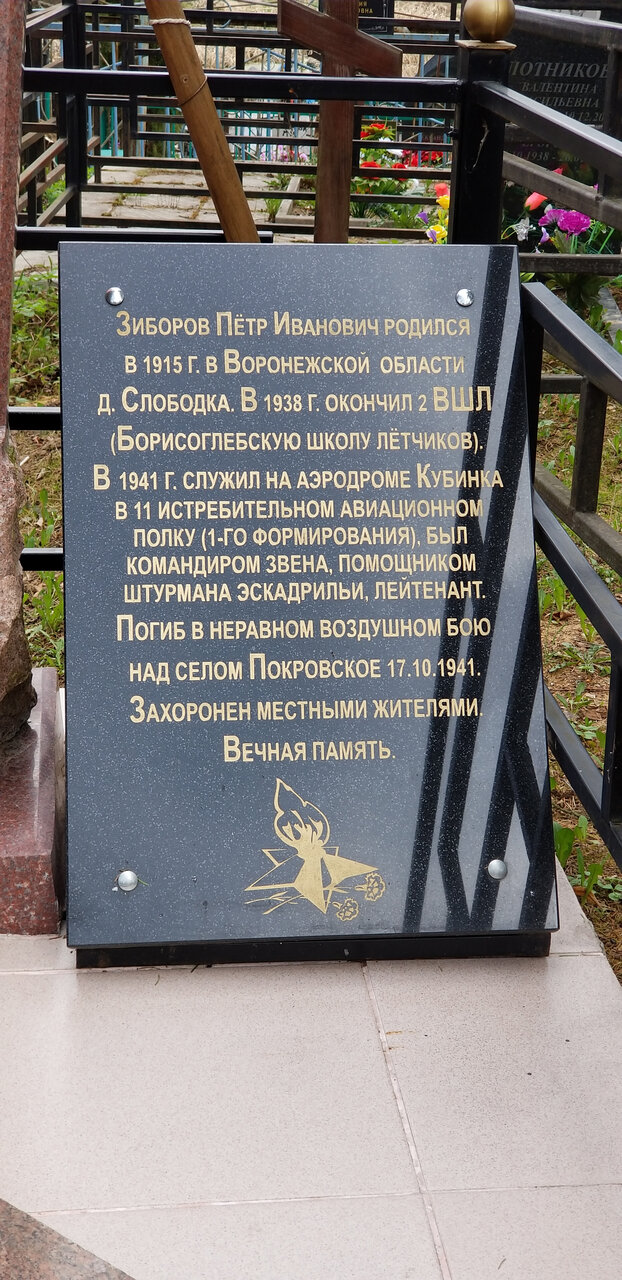 17 октября 1941 года командир звена, помощник штурмана эскадрильи 11 иап лейтенант Зиборов Пётр Иванович не вернулся с боевого задания. Погиб в воздушном бою на самолёте Як-1 в районе д. Частцы Звенигородского района. Исключён из списков Красной Армии приказом по УК ВВС КА № 03/пог от 24.01.1942.