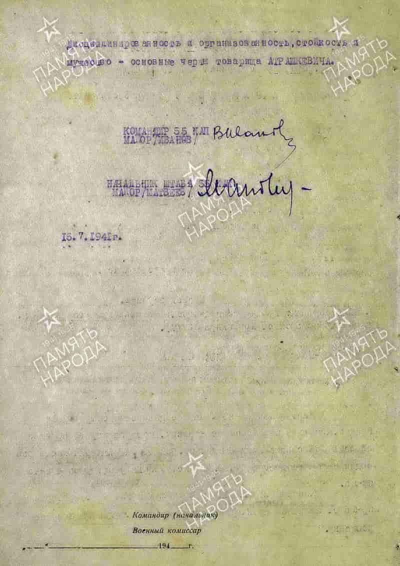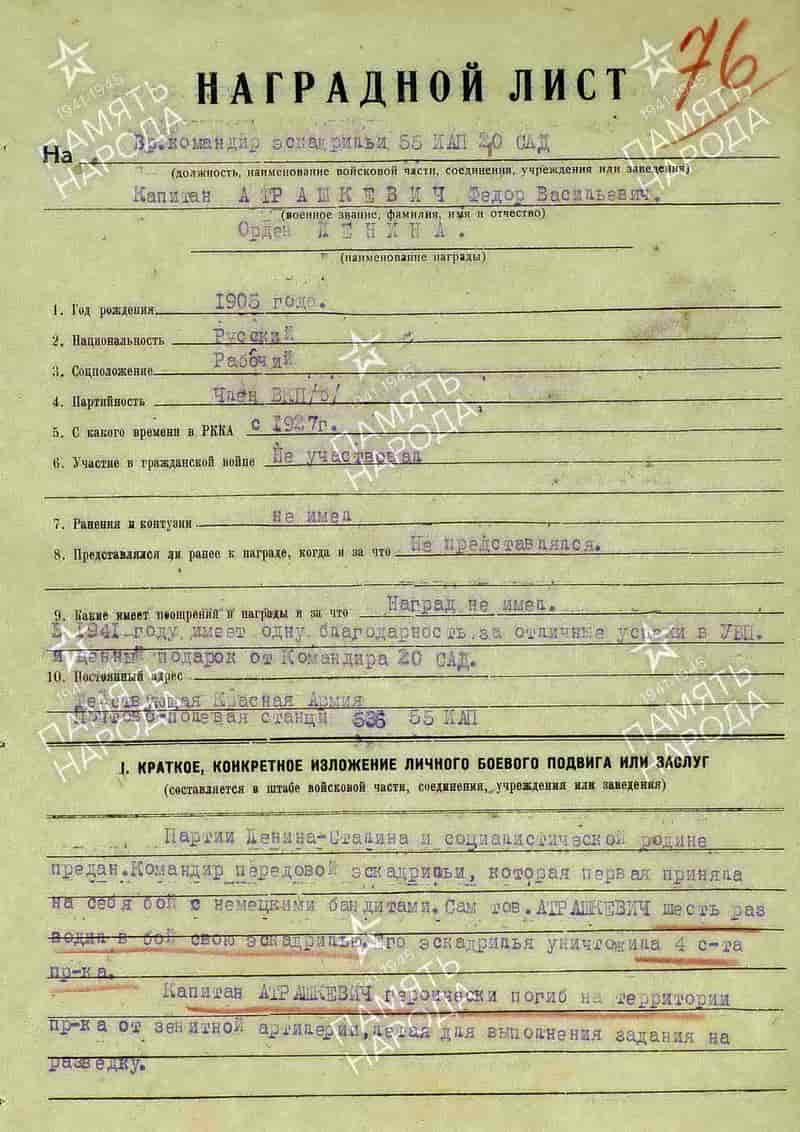 За успешное выполнение боевых заданий на фронте борьбы с немецко-фашистскими захватчиками, проявленное при этом мужество и отвагу, капитан Атрашкевич Фёдор Васильевич одним из первых был награждён орденом Боевого Красного Знамени.