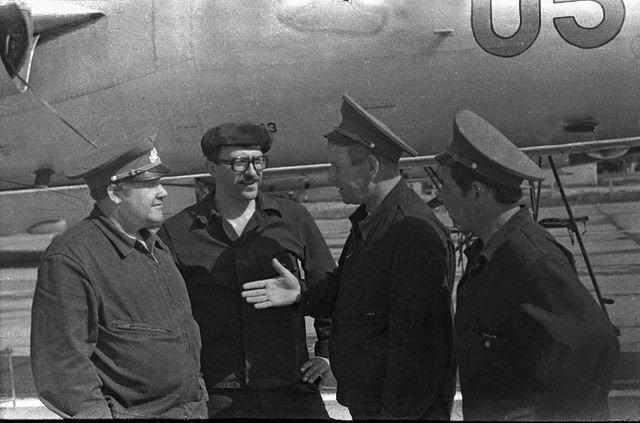 Аэродром Омск-Северный, фото 80-х годов. Штурман корабля Лосев, прапорщик группы РЛО Трофимов, заместитель командира 1 АЭ по политической части подполковник Кулик Г.Т., старший техник корабля Третьяков В.