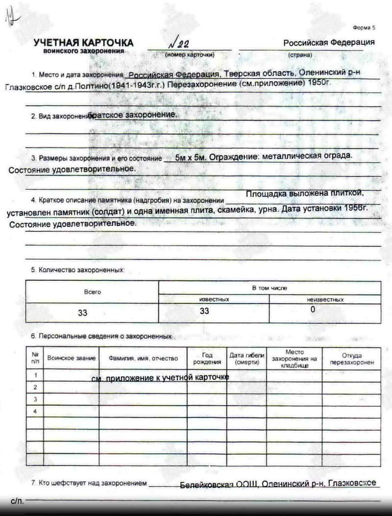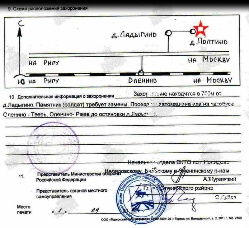 Захоронен в Братской могиле в д. Полтино Оленинского района Тверской области (захоронение № 89619358).