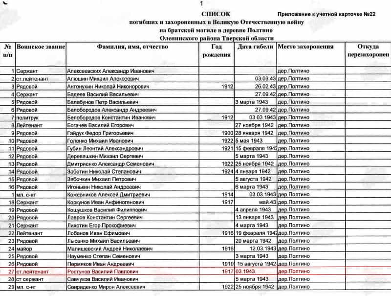 На территории нашего Кашинского округа Глазковского поселения есть деревня Лилюгино. Около д. Лилюгино находится могила воина. Надпись на плите: "Здесь 19 марта 1942 года погиб летчик-истребитель командир звена лейтенант Ростунов Василий Павлович".