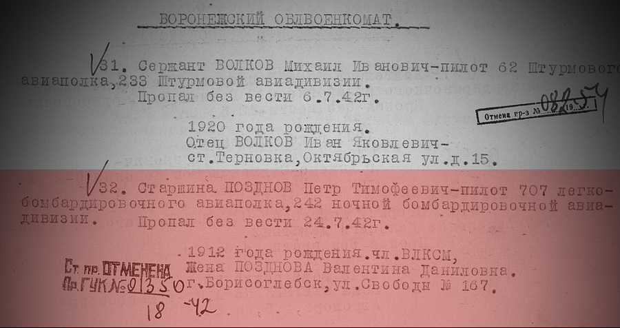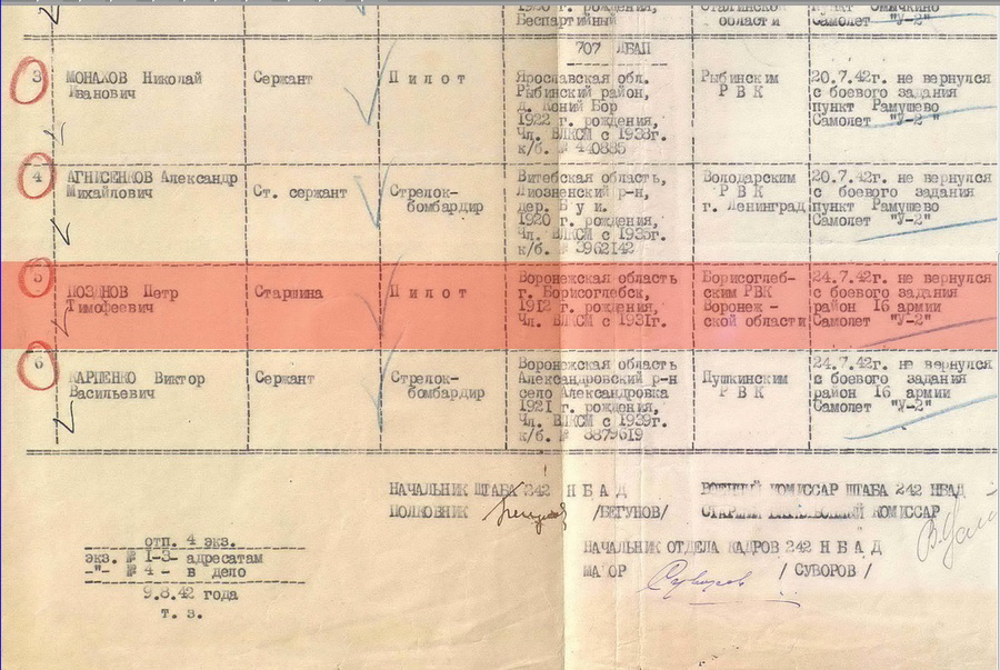 24.07.1942 с боевого задания из района 16 армии не вернулся экипаж У-2: летчик старшина П.Т. Позднов и стрелок-бомбардир сержант В.В. Карпенко.