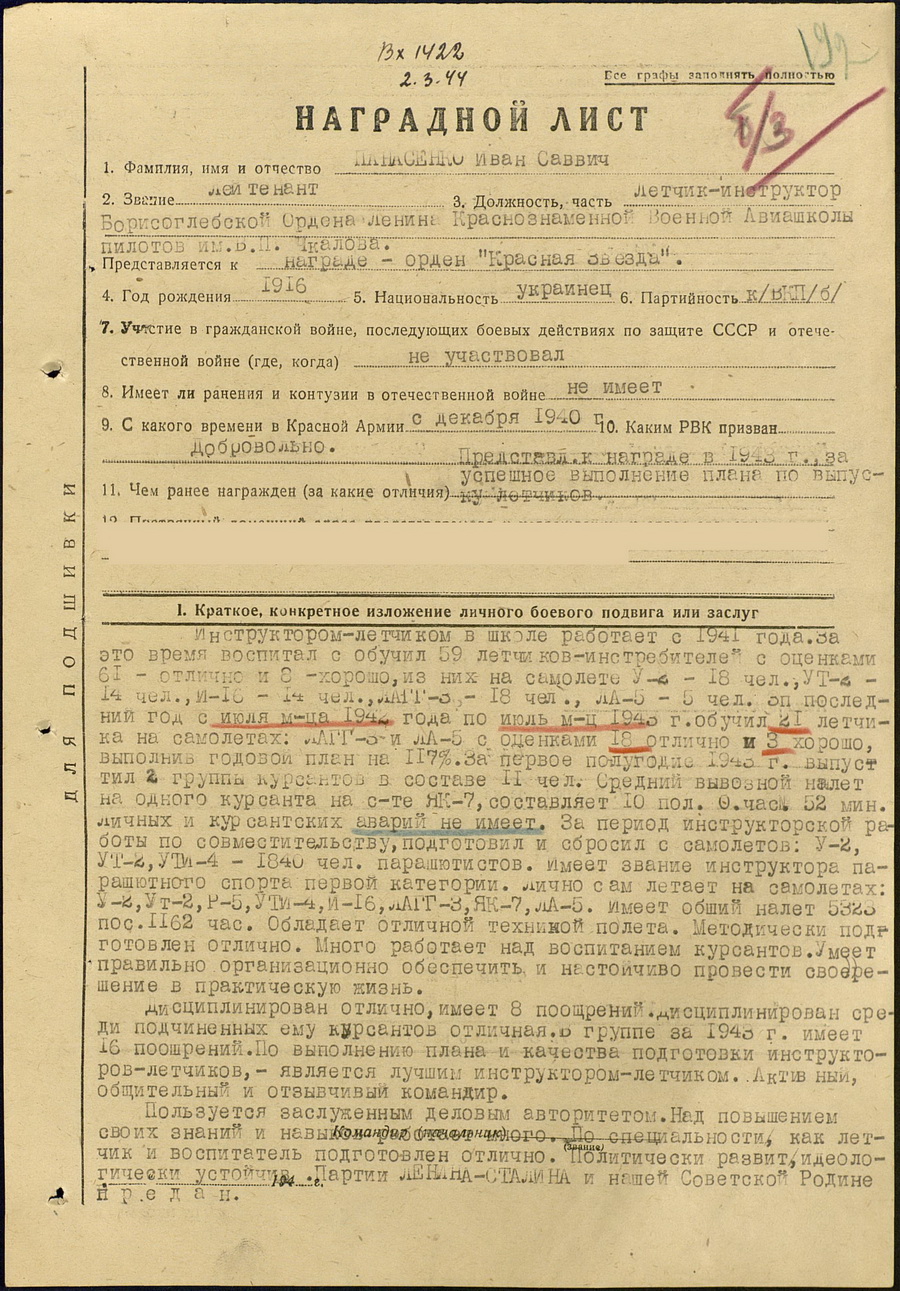 28. 10 1943 начальником Борисоглебской ВАШП полковником Курдубовым был представлен к награждению орденом Красной Звезды.