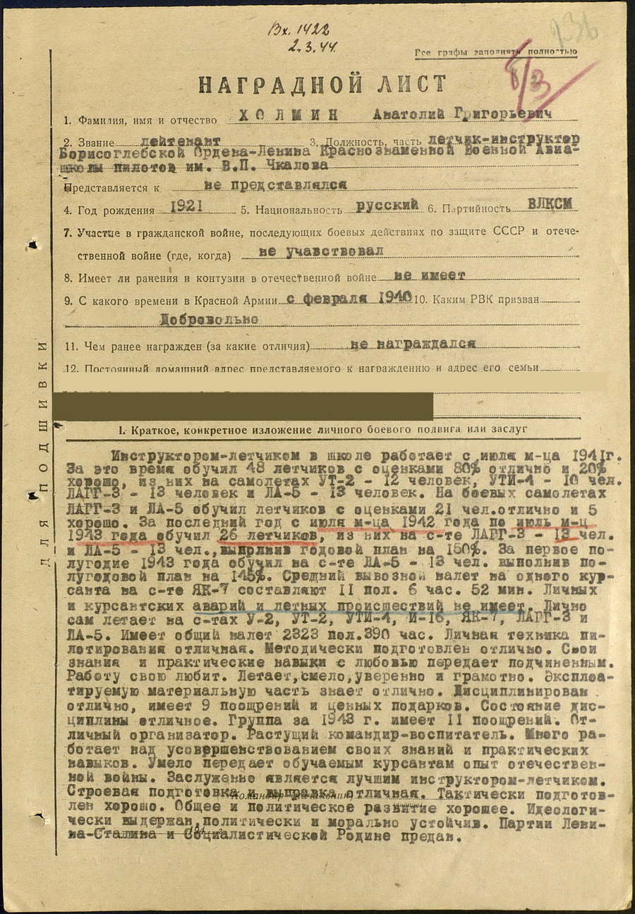 На 28.07.1943 — лейтенант, лётчик-инструктор Борисоглебской ВАШП, член ВЛКСМ. Летал на самолётах У-2, УТ-2, УТИ-4, И-16, Як-7, ЛаГГ-3, Ла-5.