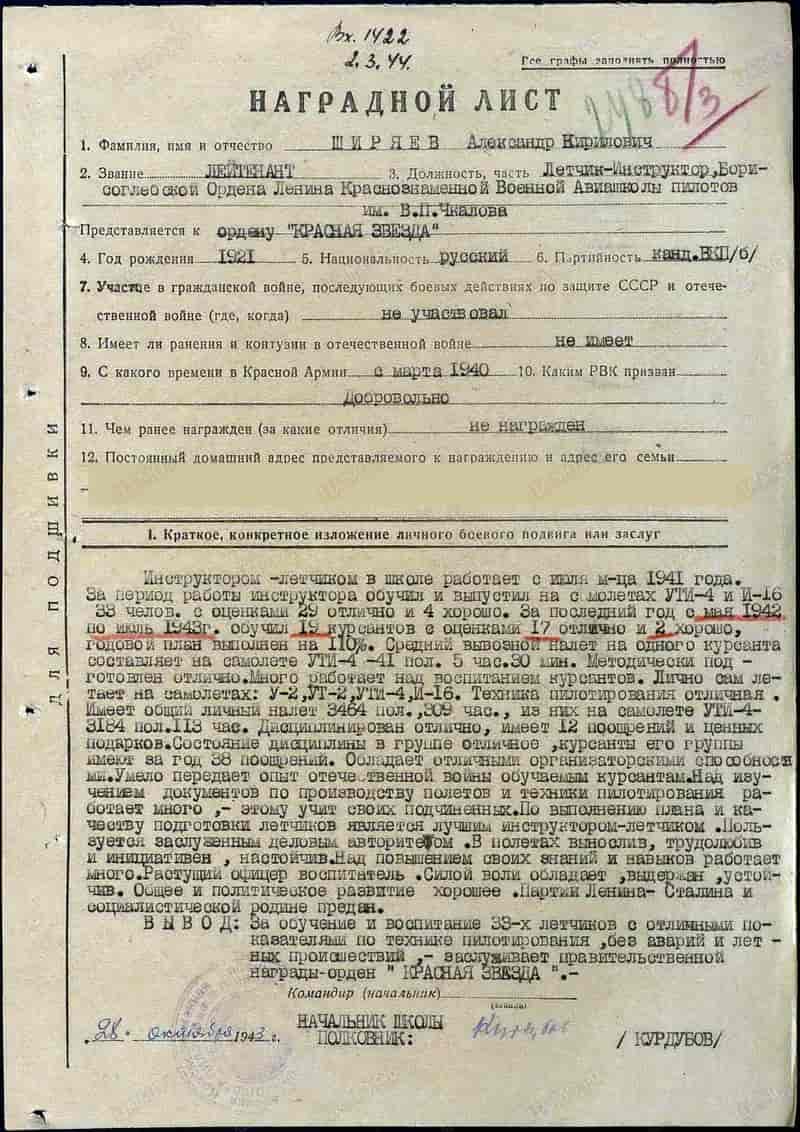 28.10.1943 лётчик-инструктор Борисоглебской ВАШП лейтенант Ширяев А.К. представлен к ордену Красной Звезды и 28.02.1944 награждён медалью «За боевые заслуги».