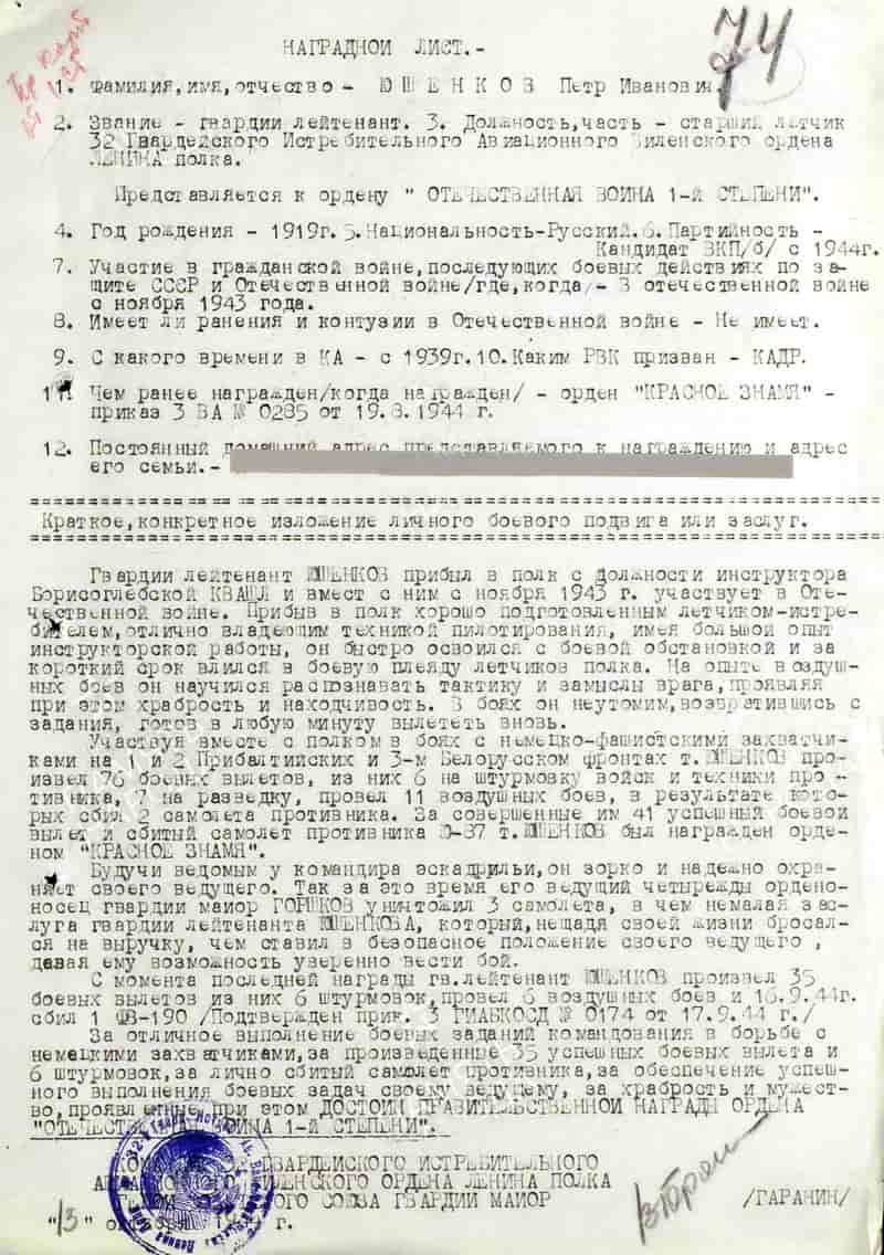 13.10.1944 старший лётчик 32 гиап гвардии лейтенант Юшенков П.И. представлен к награде.