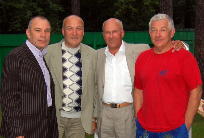 Слева направо: выпускники Борисоглебского ВВАУЛ 1976 года выпуска Шаров А.Ю. и Сибелев В.М., выпускники Ейского ВВАУЛ 1970 года выпуска Заслуженный военный лётчик РФ генерал-майор Копытов А.С., Заслуженный лётчик-испытатель СССР Герой Советского Союза Пугачев В.Г.
