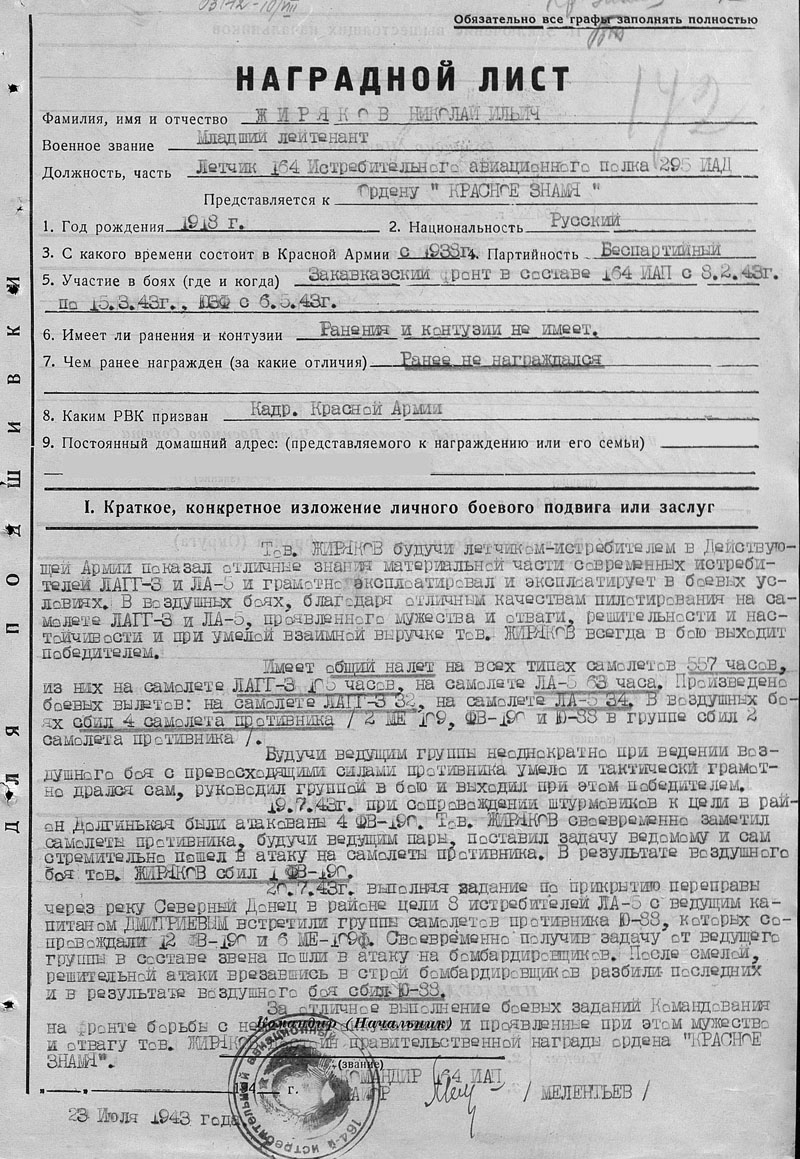 12 октября 1943 года лётчик 164-го ИАП лейтенант Жиряков Николай Ильич погиб при выполнении боевого задания (в другом документе - при катастрофе). Похоронен в с. Логоновка, Барвенковского района Харьковской области.