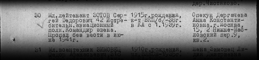 В июне 1941 года командир звена 42 иап 57 сад ВВС Прибалтийского особого ВО (Северо-Западного фронта) младший лейтенант Зотов Сергей Фёдорович пропал без вести.