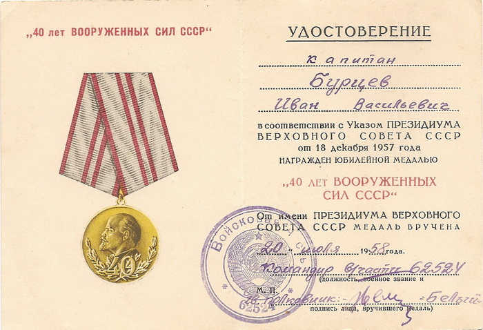 "...Удостоверение "40 лет...", подписанное командиром в/ч 65243 полковником Белым - это 103-я истребительная авиационная дивизия 52-й Воздушной истребительной армии Московского округа ПВО, которая в 1958 г. дислоцировалась в Моршанске и имела в составе в феврале 1958 г. 3 истребительных авиаполка: 153-й (г. Моршанск), 205-й (г. Ефремов) и 762-й (г. Ряжск)..."