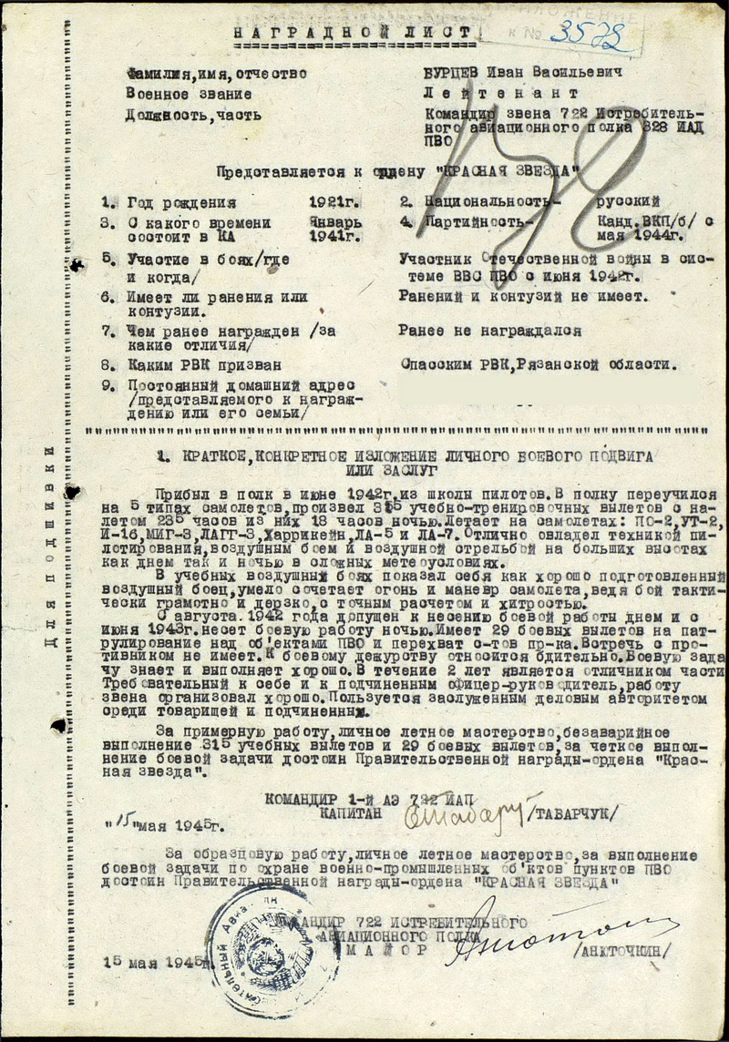 Бурцев В.И.: "...Ещё есть упоминание, а точнее архивная справка из ЦА МО от 21.06.1993 №7/п-41968 о подтверждении участия в боевых действиях во время ВОВ моей мамы, Бурцевой (Нестеренко) Нины Ивановны. Она проходила службу в составе 198 отдельного взвода ВНОС при 722 ИАП ПВО в с 15.09.1944 по 09.05.1945. Отец часто вспоминал 722 ИАП, где они и познакомились с мамой.