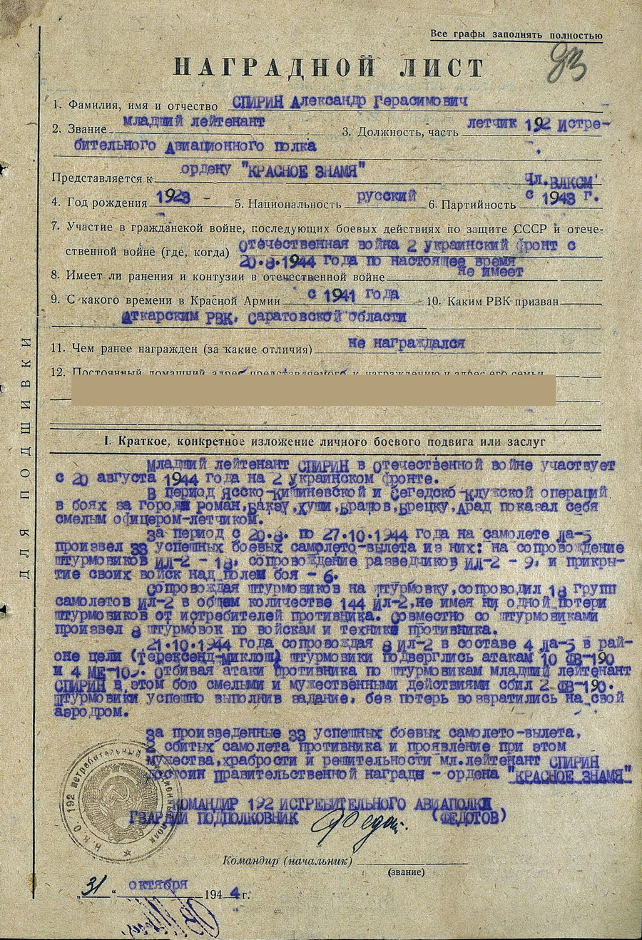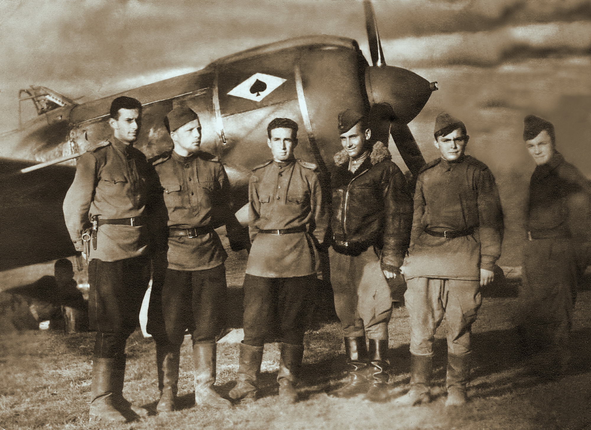 "...На фотографии летчики 192 ИАП (истребительного авиационного полка). Четвертым справа стоит мой дядя Спирин Александр Герасимович. Снято 25 октября 1944 года, г. Тоткомлош, Венгрия.