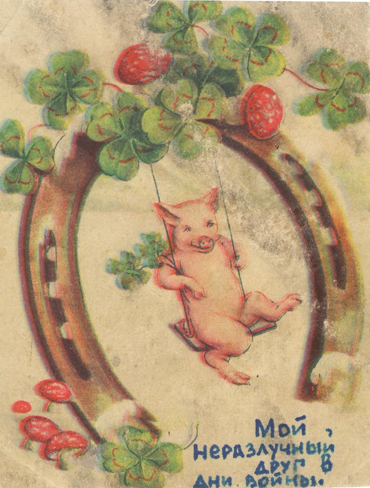 Как известно у всех боевых летчиков в то время, как правило, были талисманы. Летчики были суеверны и считали, что талисманы оберегают их. Открытка (с поросеночком), талисман моего дяди, её он неизменно брал с собой в боевые вылеты.