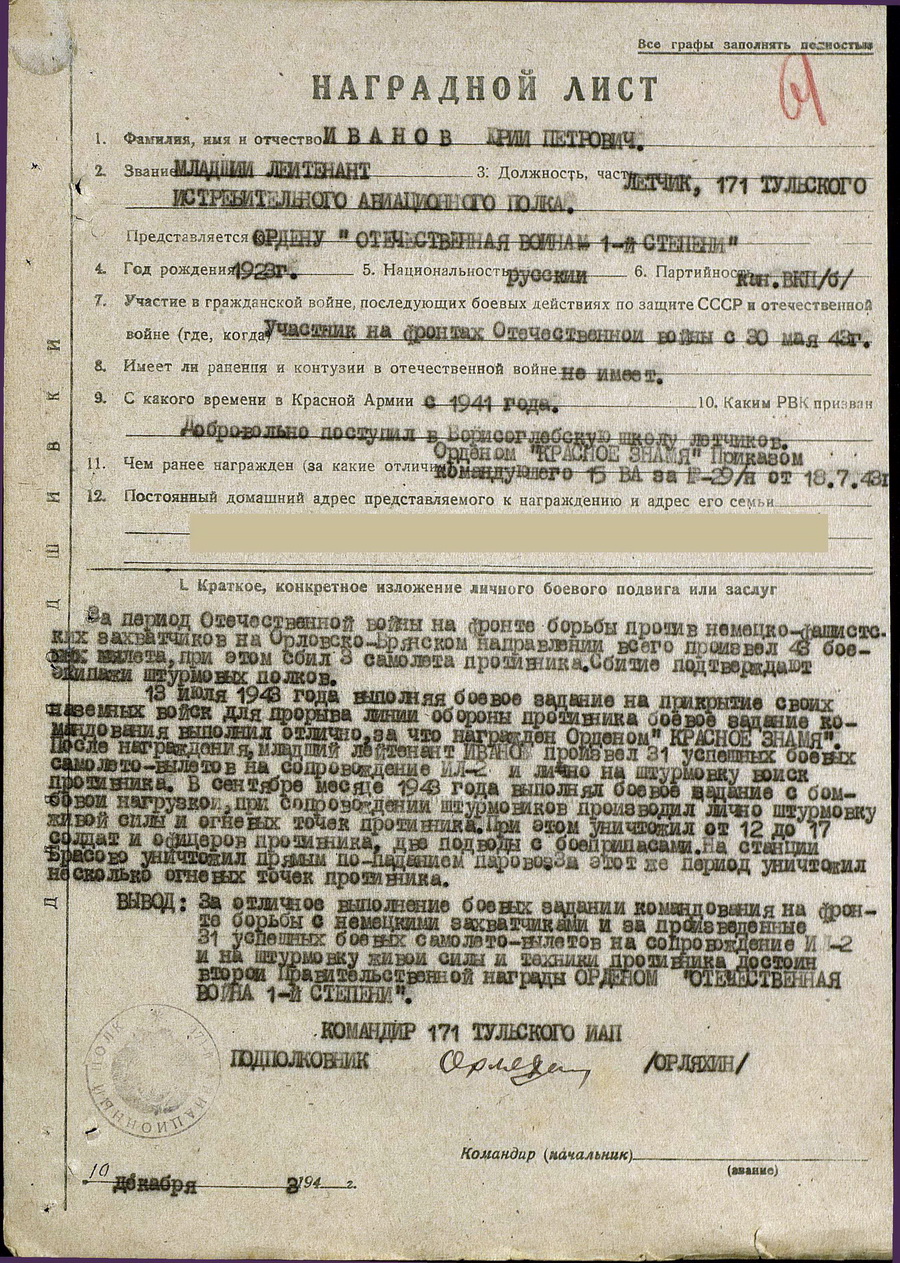 24 июля с.г., выполняя боевое задание (сопровождение Ил-2), младший лейтенант Иванов Ю.П. не вернулся на аэродром, отдав молодую жизнь за Родину. Образ юного героя будет вечно жить в наших сердцах, вдохновляя нас в священной борьбе с ненавистным врагом.