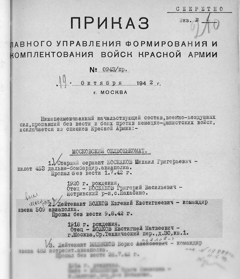 Наши потери: не вернулись с боевых заданий три экипажа – самолеты ЛаГГ-3: командир звена, лейтенант Волков Евгении Евстегнеевич (№ самолета 3353), пилот, младший лейтенант Гребенщиков (№ 3345), пилот, сержант Сачко Иван Павлович (№ 3352)».