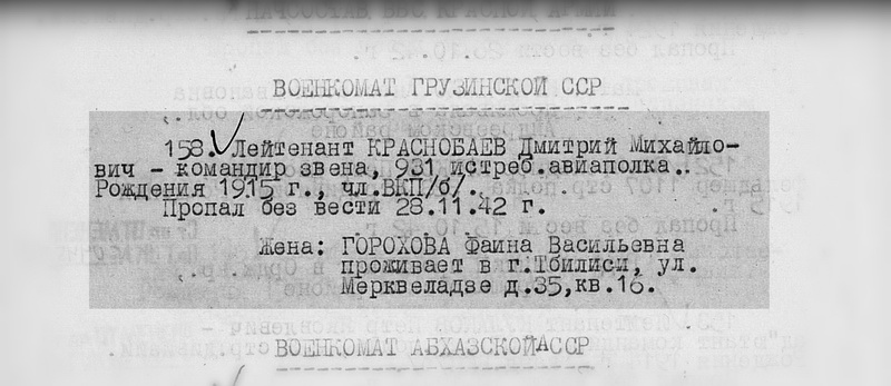 28 ноября 1942 г. командир звена лейтенант Краснобаев Д.М. не вернулся с боевого задания.