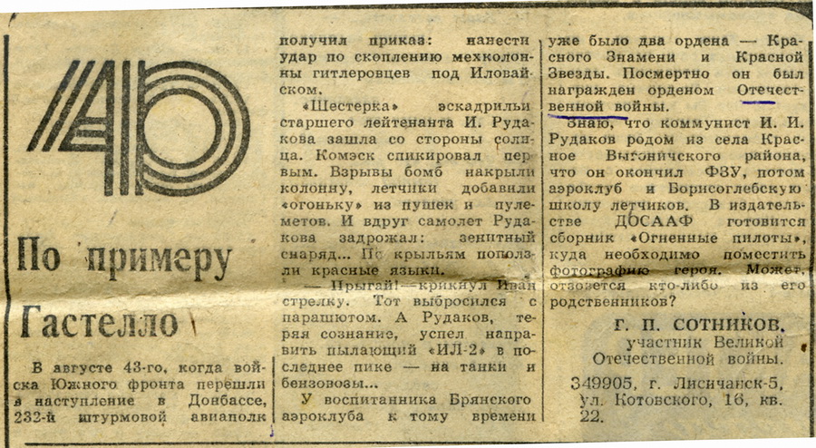 19 августа 1943 года командир эскадрильи 232-го шап старший лейтенант Рудаков Иван Иванович героически погиб под Иловайском, повторив подвиг Гастелло.