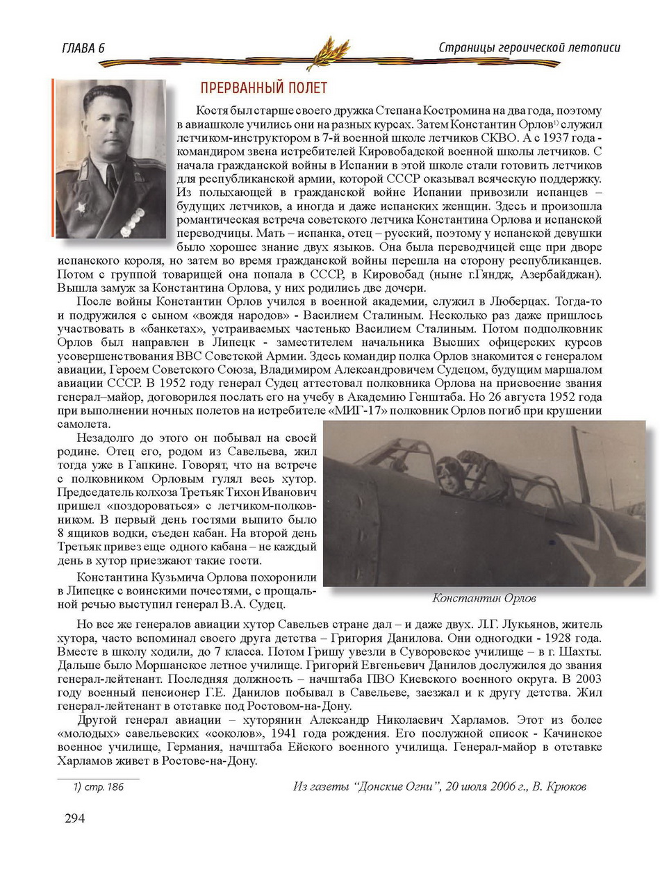 Куда только ни забрасывала судьба наших земляков. Более полувека минуло с тех пор, как отгремела Великая Отечественная война, но до сих пор мы открываем все новые и новые страницы их биографии. Орлов Константин Кузьмич — уроженец хутора Гапкина Константиновского района — прошел славный армейский путь от курсанта летной школы, в которую он попал по призыву Родины «Комсомол — на самолеты», до полковника авиа- ции.