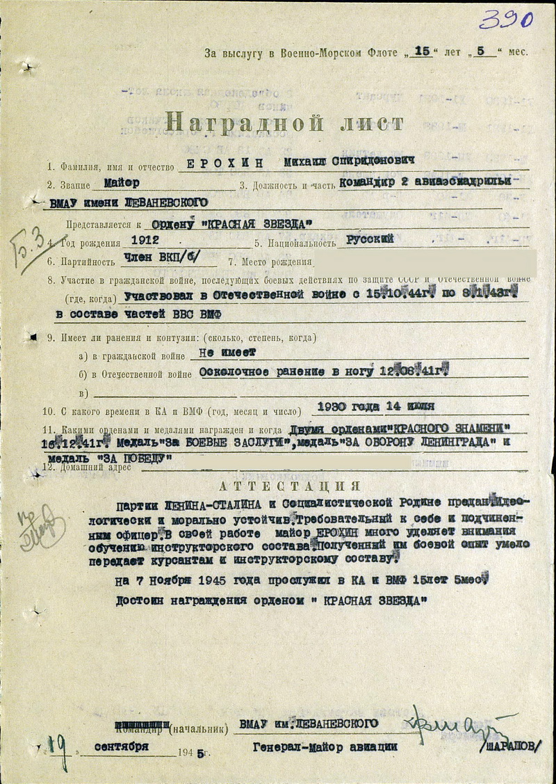 Наградной лист-представление к награждению орденом Красной Звезды:
