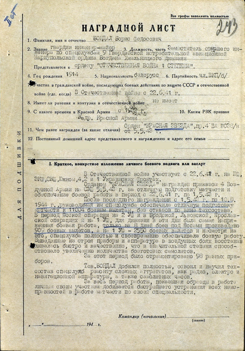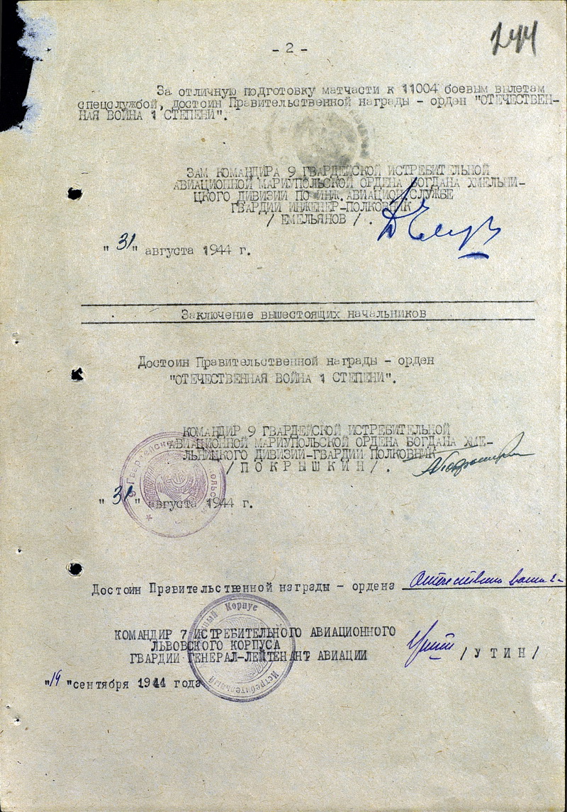 06 июня 1942 г.-17 августа 1943 г. - Инженер по электроспецоборудованию 216 истребительной авиационной дивизии (преобразованной в 9-ю гвардейскую истребительную авиационную дивизию), Южный фронт, № 0627 от 06.06.1942.