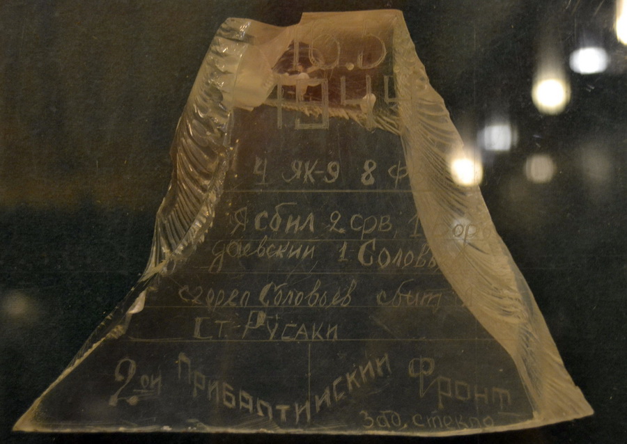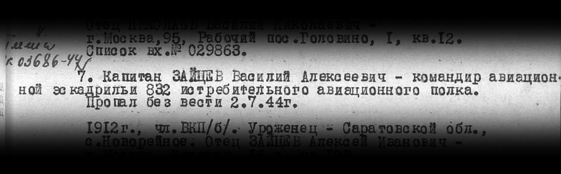 "...Вскоре газета рассказала о другом эпизоде. "Четверка самолетов Як-9, ведомая командиром эскадрильи 832-го истребительного авиаполка старшим лейтенантом Василием Зайцевым, атаковала над полем боя три группы немецких бомбардировщиков, шедших плотным строем. Чем закончилась эта атака, можно судить по числу сбитых "юнкерсов": два уничтожил ведущий, по одному - ведомые: старший лейтенант Бородаевский и лейтенант Соловьев. Строй вражеских бомбардировщиков рассыпался, и они стали поспешно, куда попало сбрасывать свой груз". Двадцать пять лет спустя представилась возможность продолжить этот рассказ, дополнив его новыми сведениями о летчике-истребителе Василии Алексеевиче Зайцеве и его друзьях, о подвиге, свершенном ими в майские дни 1944 г. Каким был, каким виделся своим однополчанам командир третьей эскадрильи 832-го истребительного авиаполка старший лейтенант Зайцев? - С виду настоящим богатырем, - отвечал агитатор политического отдела дивизии капитан Филипп Рябов. - На него смотришь - глаз не отведешь. Проникновенный, открытый и очень сосредоточенный взгляд, в котором чувствуется пытливая мысль. Лицо исключительно энергичное, волевое. Да, Зайцев волевой человек. Иначе как бы мог он добиться разрешения уйти на фронт с работы летчика-испытателя, откуда его ни за что не отпускали. Богатырем представлялся однополчанам этот истребитель. Такие часто встречались на любом фронтовом аэродроме, по все-таки он чем-то выделялся. Командир водил на задания свою эскадрилью и группы поменьше - чаще четверку. Четверку повел и 16 мая в район, где продолжались бои местного значения. Четверка, встретив восемь "фокке-вульфов", действовала с присущей ей решительностью, атаковала умно, расчетливо. Силы противника таяли, и, казалось, победа близка. Но неожиданно враг получил подмогу, и тогда чаша весов склонилась в его сторону. В небе горело несколько самолетов - чужих и своих. Был подбит "як" Зайцева. Он стал тянуть на восток и в конце концов упал на своей территории. Лётчик чудом остался жив. На обломке бронестекла тогда он выцарапал ножом: "16.5.1944. 4 ЯК-9, 8 ФВ-190. Я сбил 2 ФВ, 1 Бородаевский, 1 - Соловьев. Сгорел Соловьев, сбит я. Ст. Русаки. 2-й Прибалтийский фронт". ...Много лет спустя этот обломок занял место в экспозиции Центрального музея Вооруженных Сил СССР..."