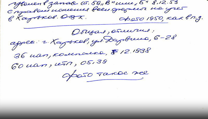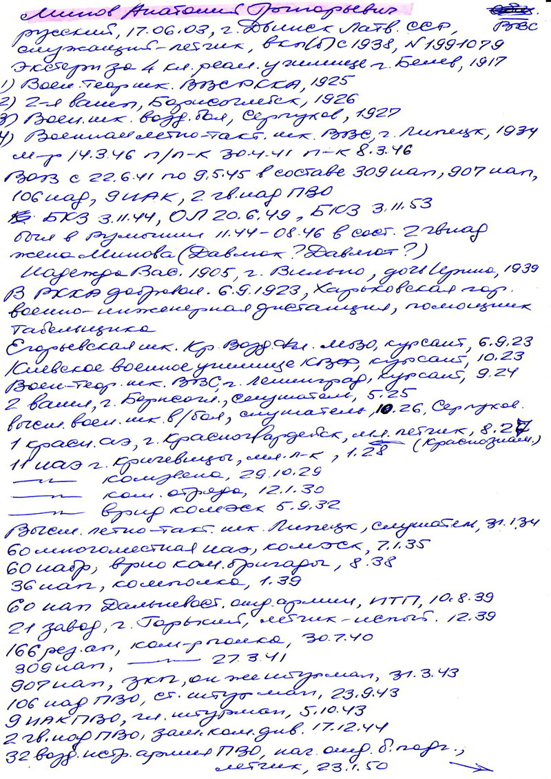 Высылаю учётно-послужную карту Минова, переписанную мной от руки. В отличие от других родов войск, на лётчиков есть ещё отдельная картотека, поэтому, по сути, у меня там идёт компиляция двух карточек - карточка из картотеки ВВС, а потом сведения по карте из общей картотеки, которые расходятся с картой из картотеки ВВС. Пишите, если-что-то Вам не будет понятно в почерке или т.п.