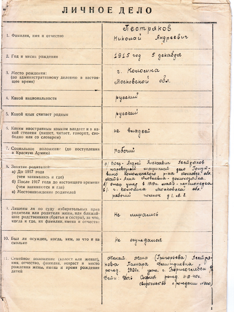 Пестряков Николай Андреевич родился 5 декабря 1915 года в г. Коломне Московской области. По национальности русский.