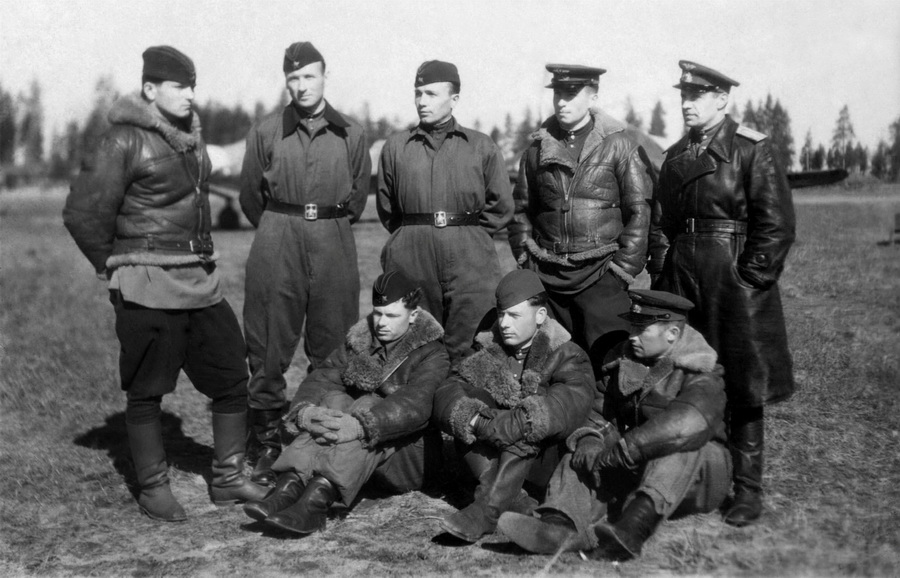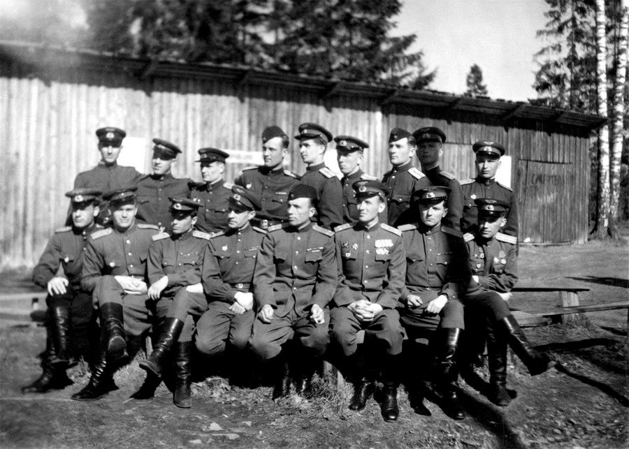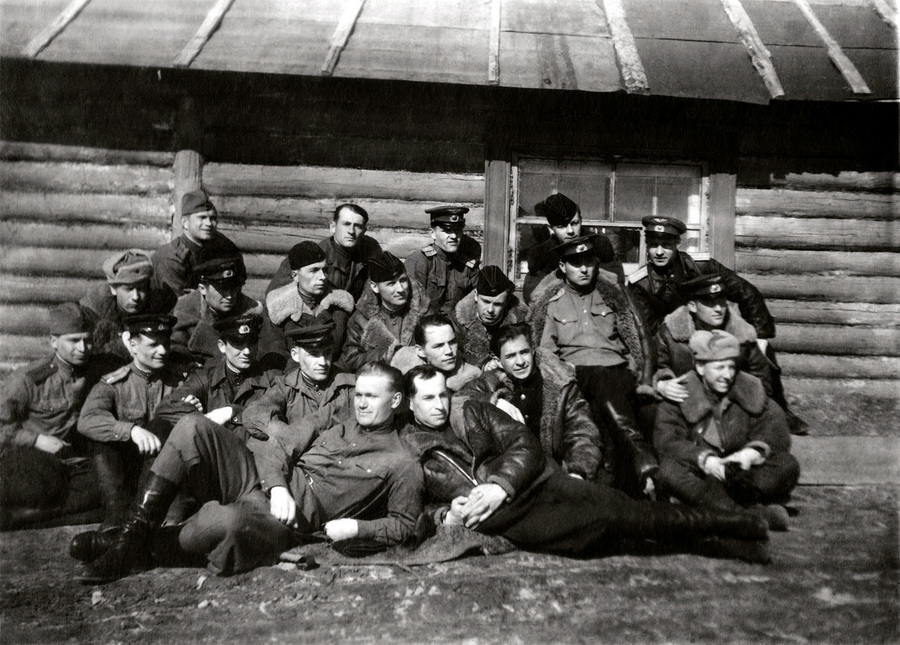 2-й ряд: (?), Кузьменко, (?), Болдырев, Горбачев, Жилеостов, Федотов (8.03.45 сбил последний самолет противника в Ленинградском небе).