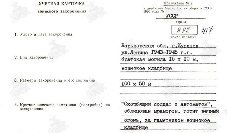 Первичное место захоронения: Украинская ССР, Харьковская область, Купянский район, г. Купянск, братское кладбище.