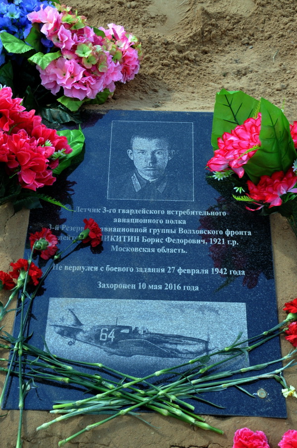 27 февраля 1942 года пилот 3 гвардейского иап 3-й Резервной авиационной группы Волховского фронта лейтенант Никитин Борис Фёдорович на самолёте ЛаГГ-3 при сопровождении бомбардировщиков Пе-2 в районе Курбанов Остров не вернулся с боевого задания, был сбит в воздушном бою. Числился пропавшим без вести.