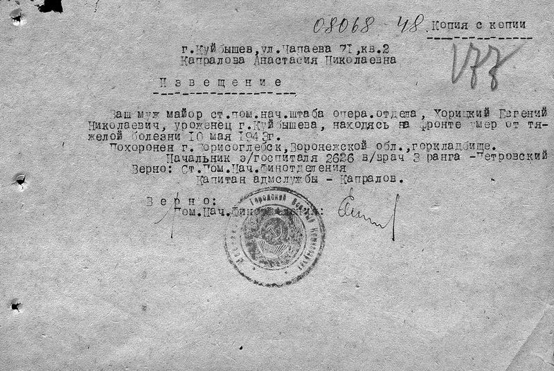 10 мая 1943 года старший помощник начальника штаба оперативного отдела 294 истребительной авиационной дивизии майор Хорицкий Евгений Николаевич умер от тяжёлой болезни (лимфогранулематоз, сепсис, пневмония) в эвакогоспитале 2626 .