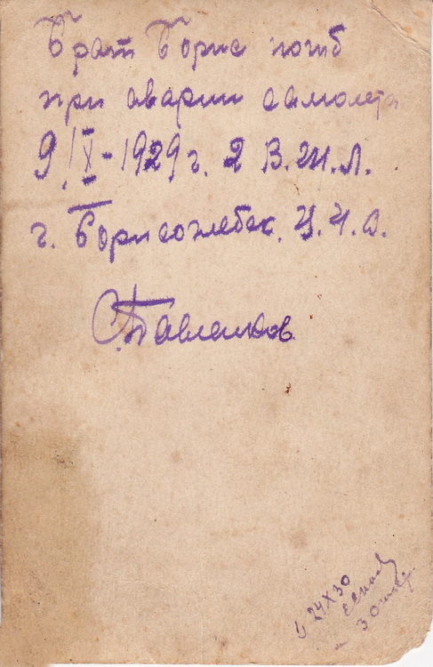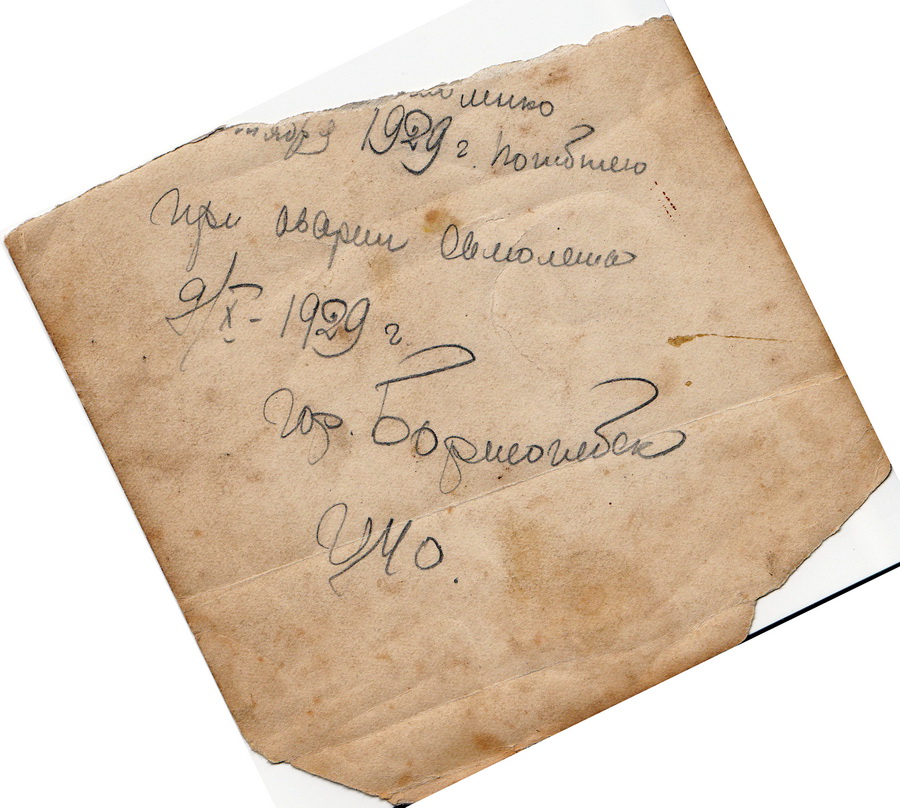 Погиб при аварии самолёта 09 октября 1929 года. Похоронен в г. Борисоглебске.