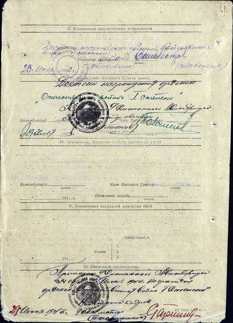 Награждён Орденом Отечественной войны I степени. Наградной лист: