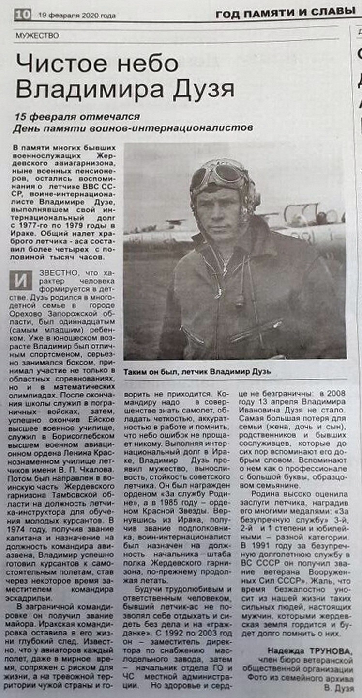 Дузь Владимир Иванович - военный лётчик ВВС СССР, родился 30 сентября 1946 года в г. Орехово Запорожской области. Он вырос в многодетной семье, был одиннадцатым ребёнком в семье, самым младшим.