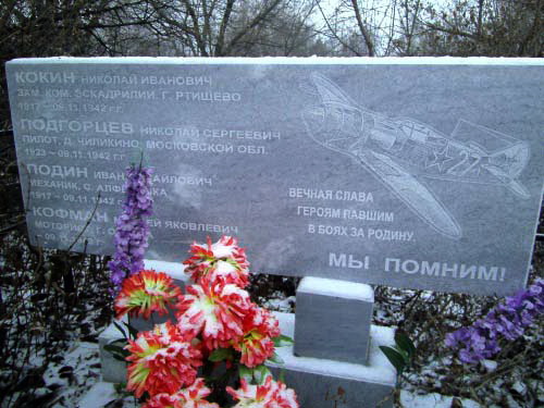 Долгое время могила лётчиков была безымянной. К 65-летию Великой Победы по инициативе учащихся Малогрибановской школы, которые восстановили имена героев, сельская администрация установила на месте захоронения (на территории сельского кладбища) памятник. Он представляет собой расположенную на тумбе надгробную плиту, на которой высечены имена лётчиков: Кокин Николай Иванович, Подгорцев Николай Сергеевич, Подин Иван Михайлович, Кофман Моисей Яковлевич, погребённых в братской могиле.