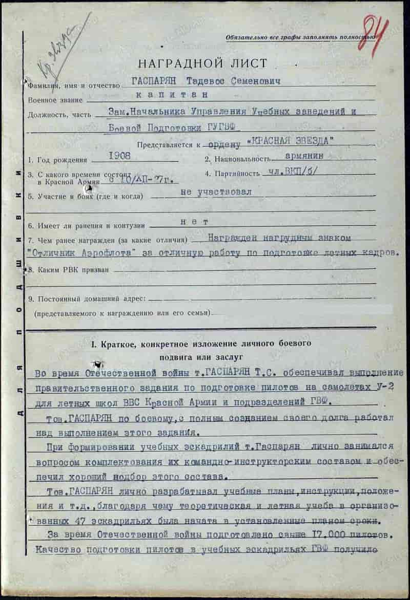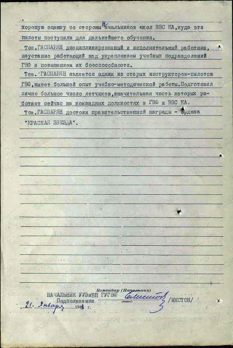 21.01.1943 - заместитель начальника Управления учебных заведений и боевой подготовки ГУ ГВФ капитан Гаспарян Т.С. представлен к награде и 07.02.1943 награждён орденом Красной Звезды.