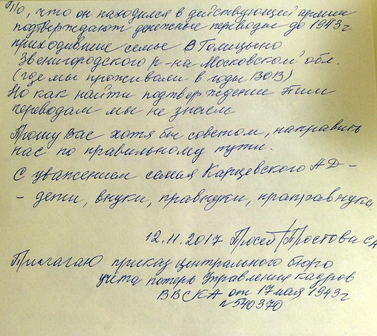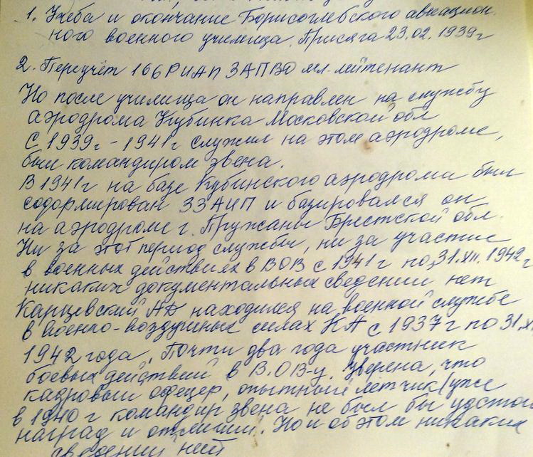 "...Могу уточнить, что на 22.06.1941 года он служил в 74-м шап, который в июле 1941 года переброшен под Киев. Он упомянут и в ЖБД полка и в списке потерь: "пилот мл. лейтенант Карцевский Александр Дмитриевич 11.7.41 года при выполнении боевого задания не вернулся на свой аэродром".