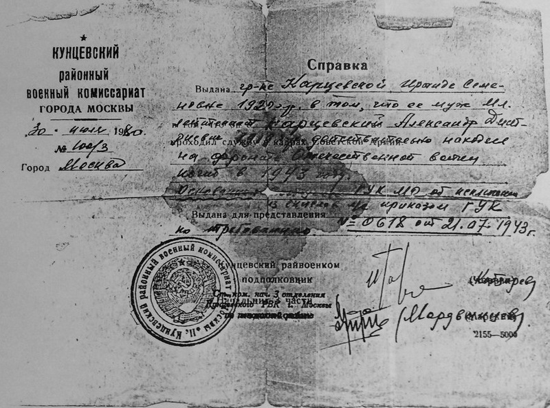Жена Карцевская Ираида Семёновна 1920 года рождения проживала на станции Голицино Западной железной дороги дом литер "Г" Звенигородского района Московской области.