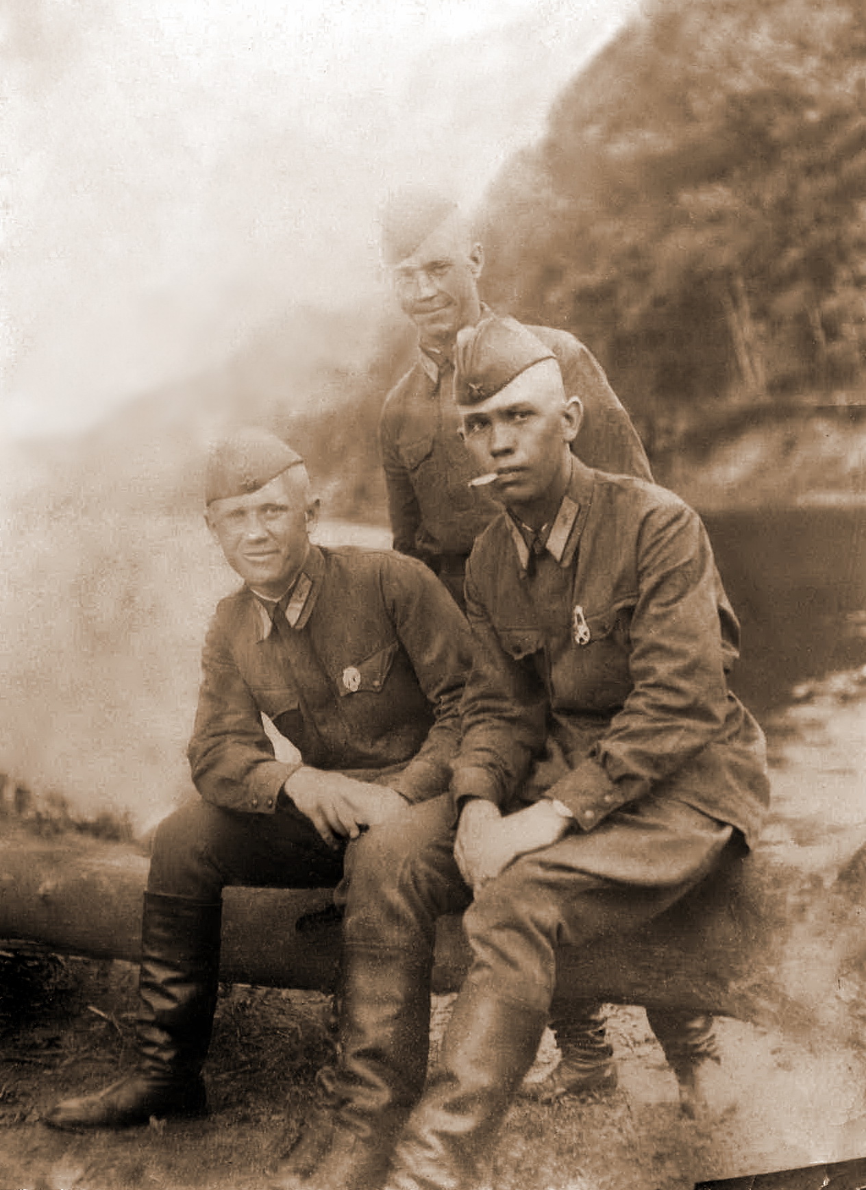 Мой дед слева первый сидит и еще двое курсантов на берегу озера с надписью на обороте: "Лодочная станция школы фотографировались 18.6.1938 года Акимов Скворцов Федоров". Предположительно лодочная станция рядом с поселком Танцирей
