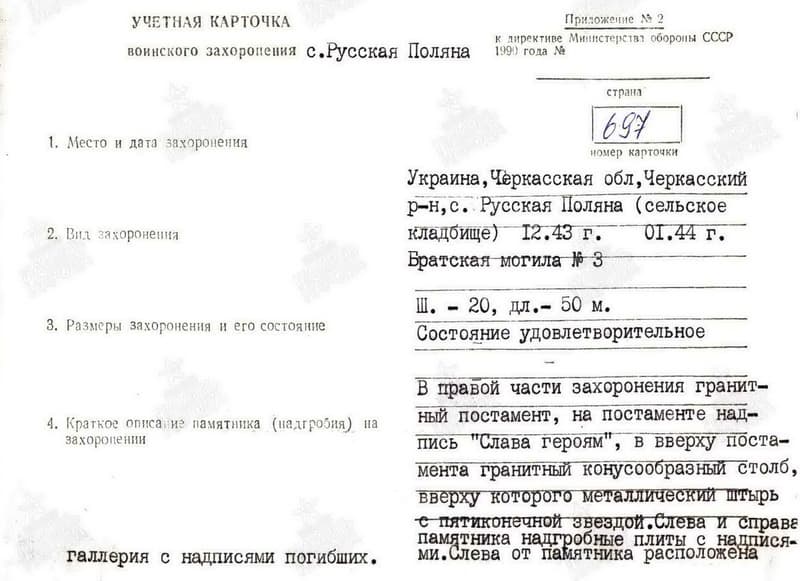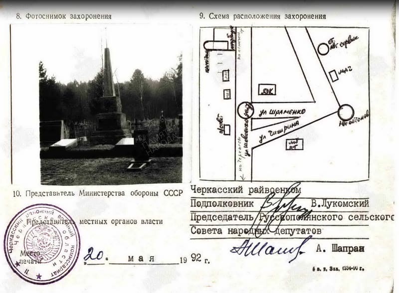 Похоронен в Братской могиле № 3 в с. Русская Поляна Черкасского района Киевской области Украины.