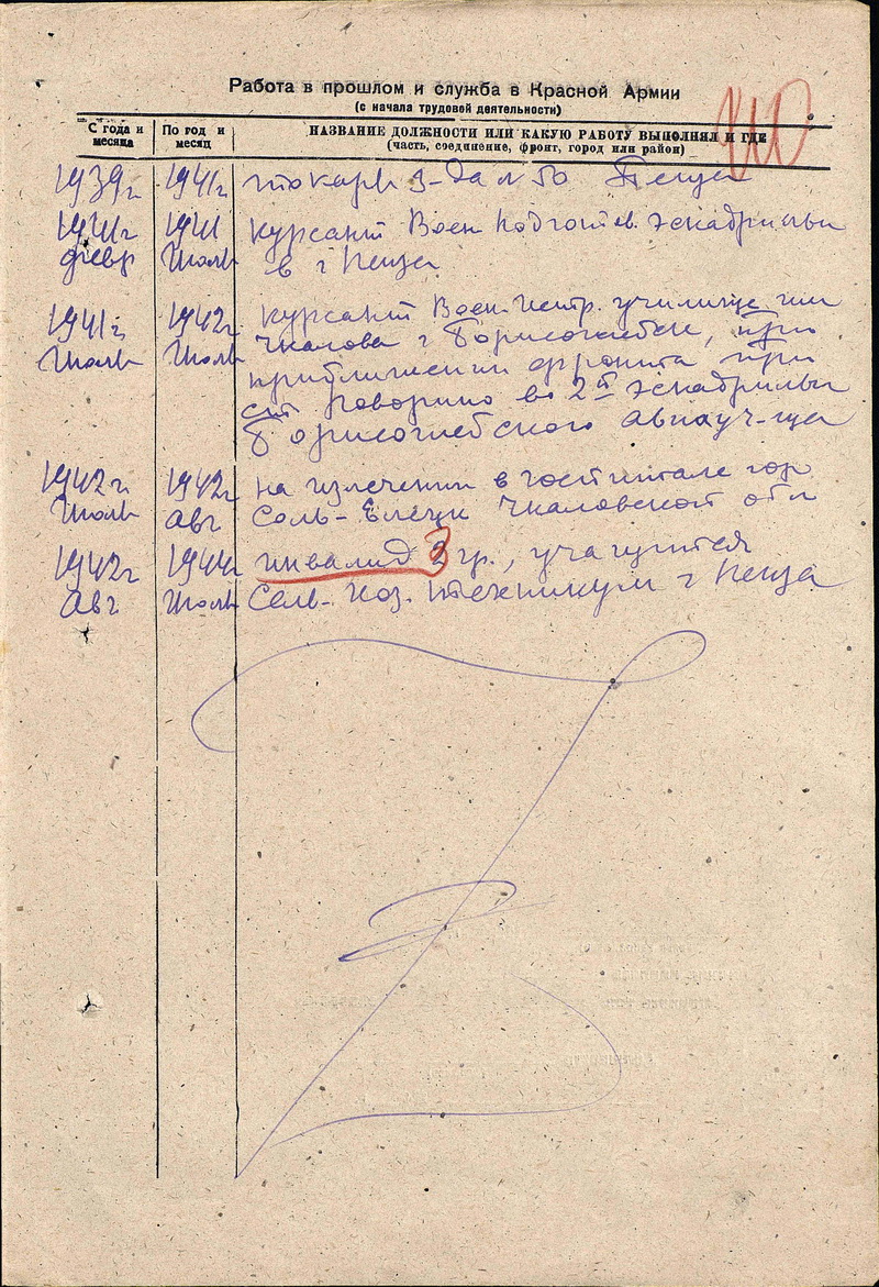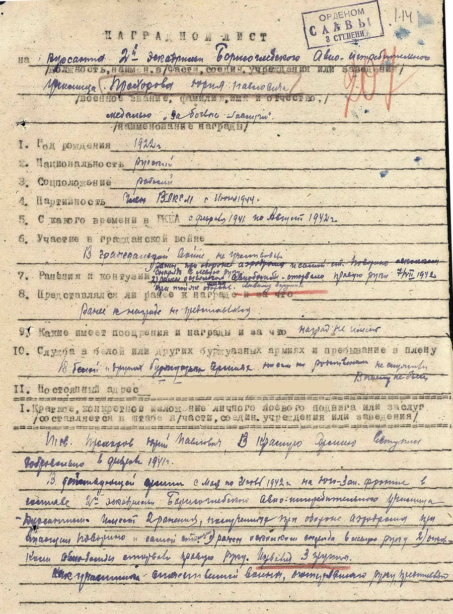 При налёте вражеской авиации на железнодорожную станцию Поворино будучи курсантом 2 эскадрильи Борисоглебской ВШЛ был ранен осколком снаряда в левую руку.