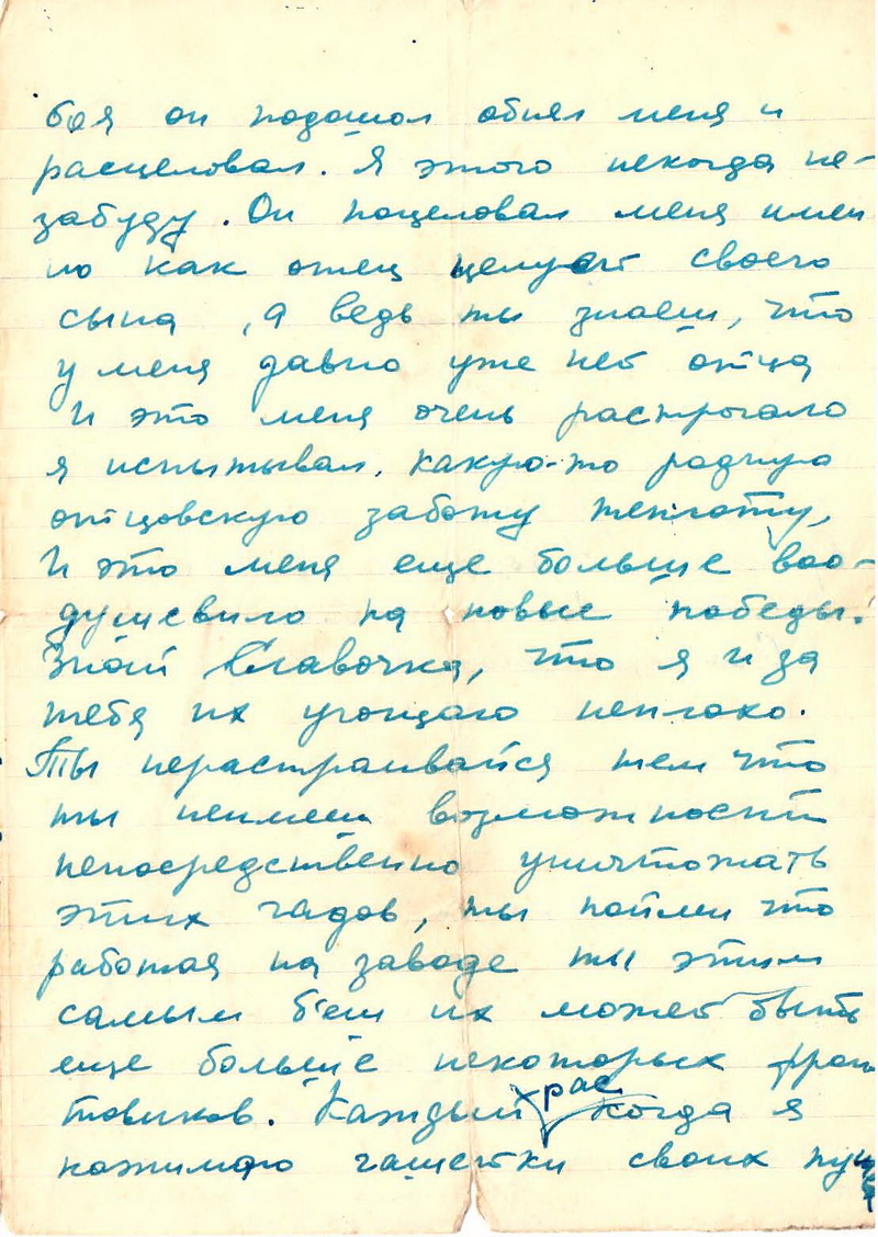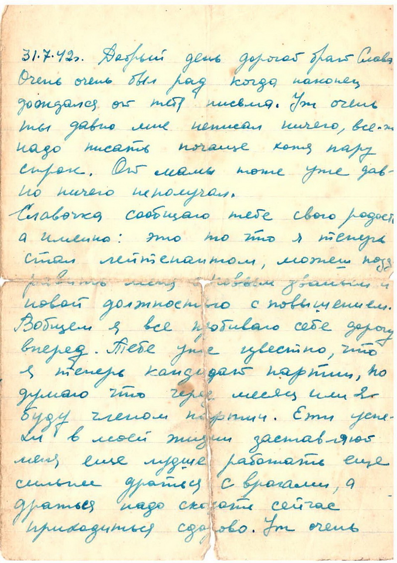 Второе письмо более короткое, на 4 листа. Возможно, что на момент его получения автора уже не было в живых: письмо датировано 31.07.1942, за 10 дней до гибели Алексея. Письмо сохранилось лучше, чем предыдущее, поэтому публикую его сканы в оригинале: