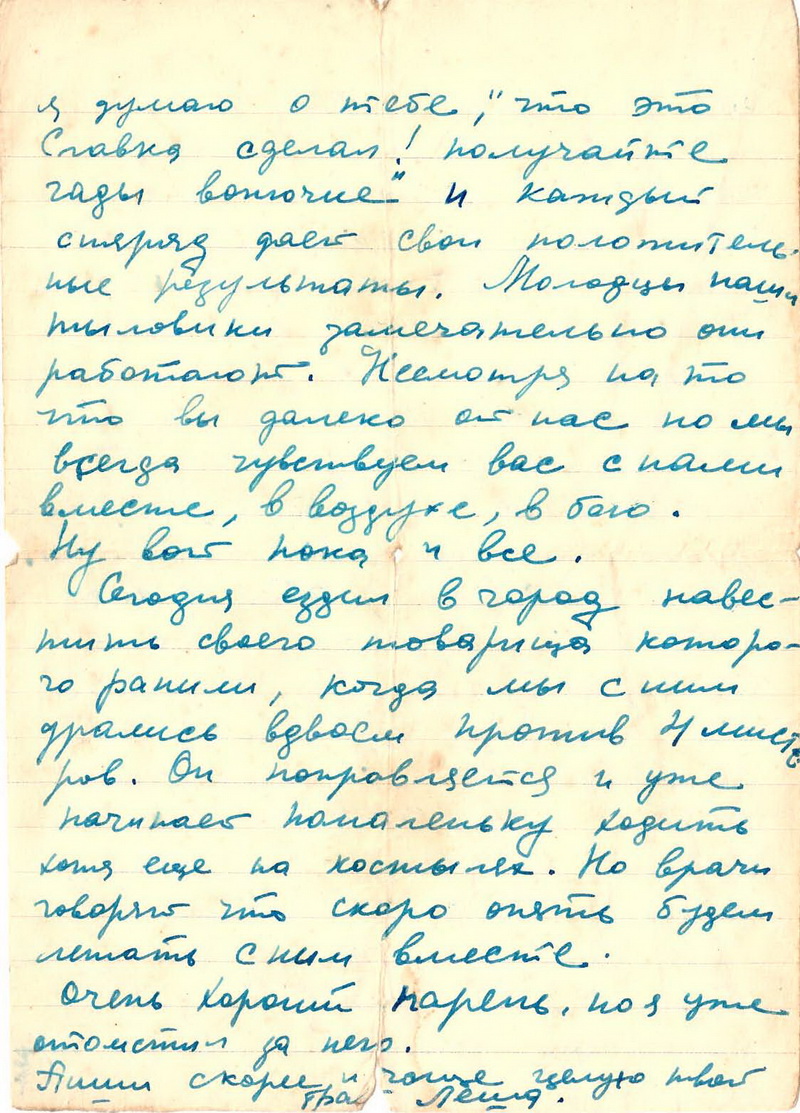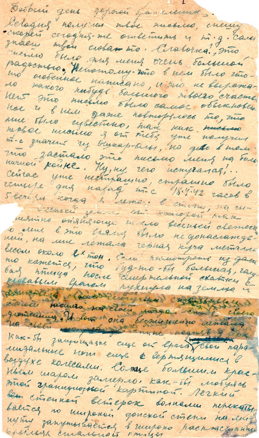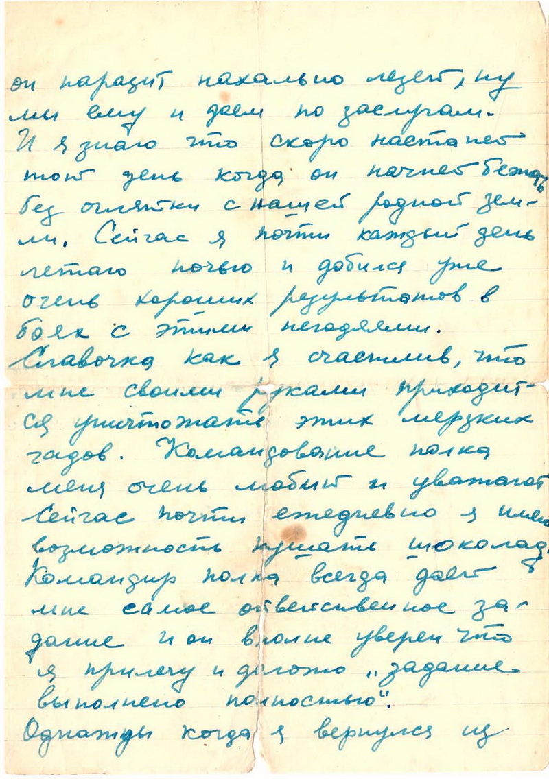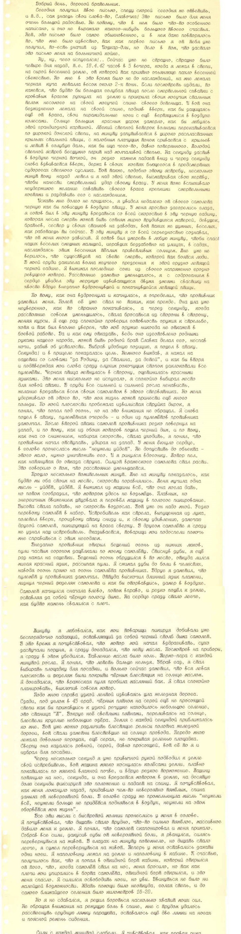Первое состоит из семи листов, и в нём содержится подробное красочное описание Алексея Красикова одного из воздушных боёв, в котором он сбил вражеский бомбардировщик. У парня явно литературный талант. А ещё в рассказе присутствуют именно те детали, которые часто стираются из памяти при написании воспоминаний в более позднее время.