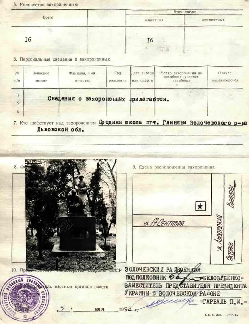 Захоронен в Братской могиле на кладбище пгт. Глиняны Глинянского района Львовской области Украинской ССР (захоронение № 83885932).