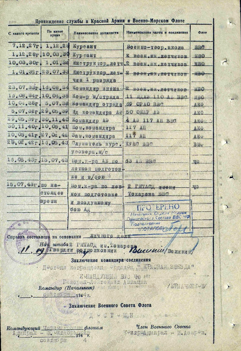 С 8 октября по декабрь 1943 года - командир 2-го минно-торпедного авиационного полка ВВС ЧФ (5-го гвардейского минно-торпедного Констанцского ордена Отечественной войны авиационного полка ВВС ЧФ), майор. Полк летал на самолётах ДБ-3Ф и Ил-4.